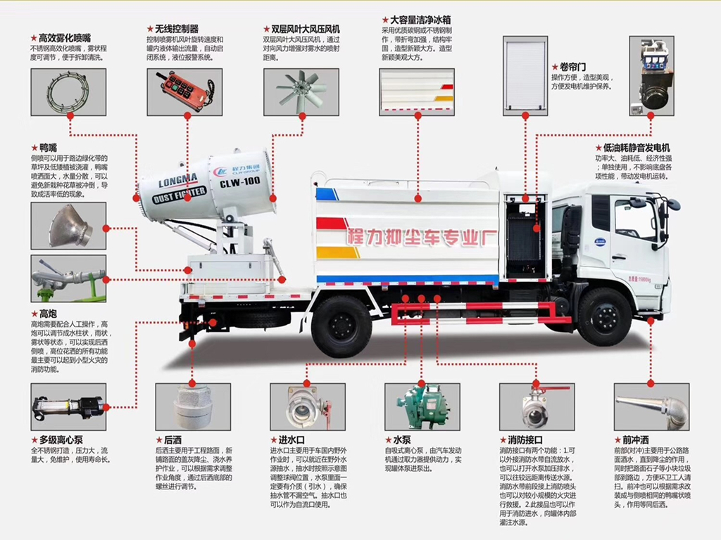 • 霧炮抑塵車:用于鐵路煤炭運輸煤揚塵污染防治,也廣泛用于其它散裝物料運輸過程防揚塵污染以及渣料場、儲煤場、建筑工地、汽車運煤揚塵、固沙、鋼鐵建材、水泥、企業(yè)各種露天料場生態(tài)護坡等方面。同時具備灑水車功能,在噴灑作業(yè)時可實現(xiàn)360度旋轉(zhuǎn),后平臺高炮可同時進行旋轉(zhuǎn),并可電子遙控操作,射程25-120米均有。