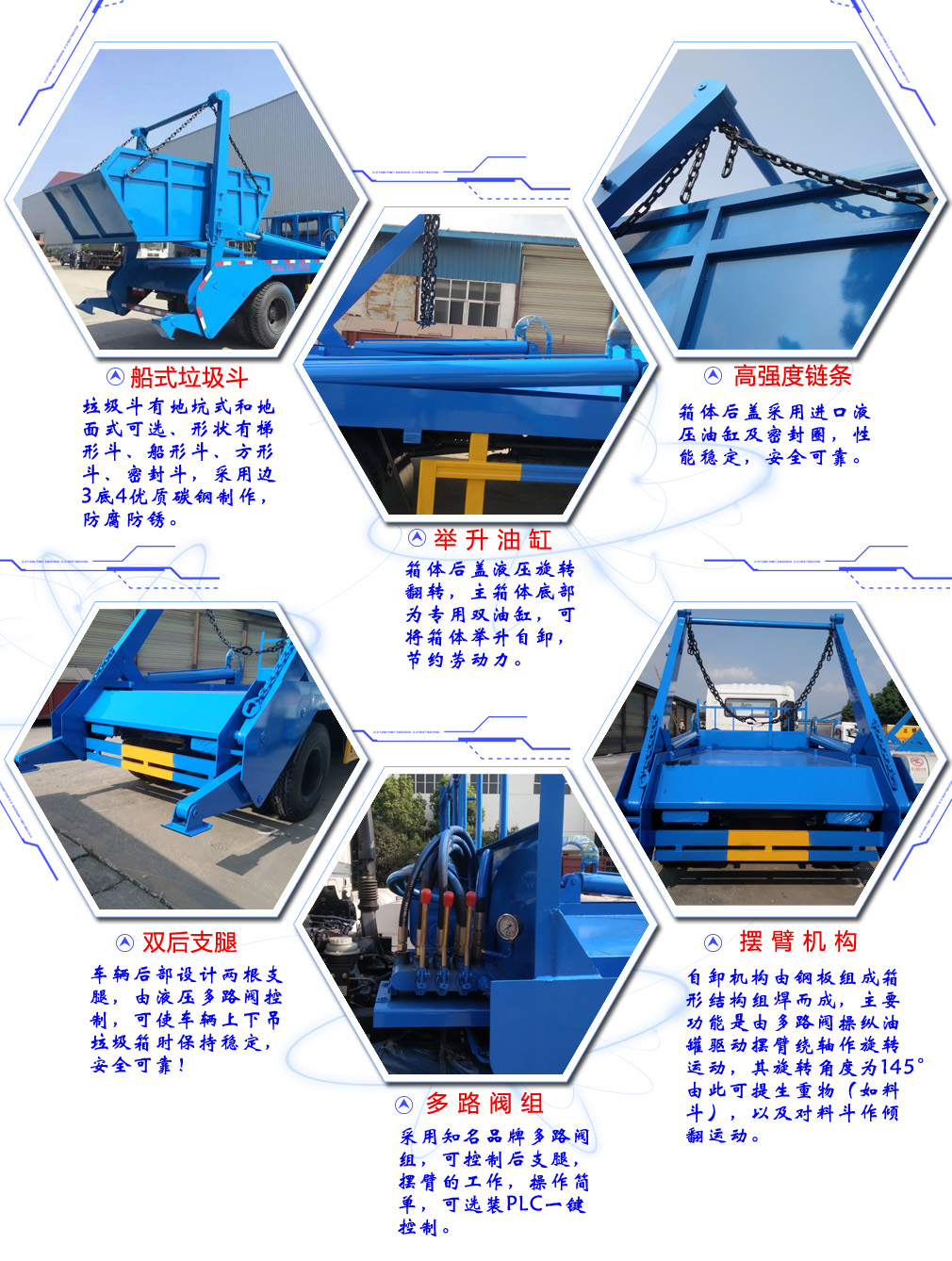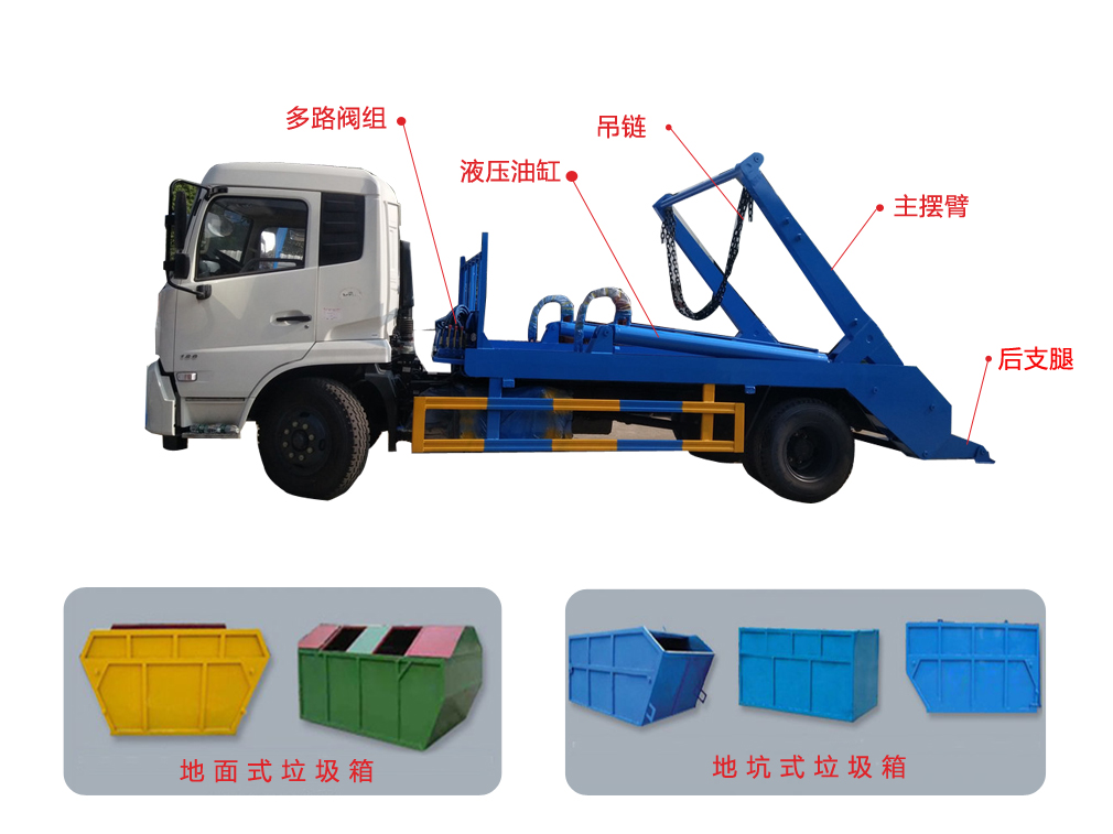 • 擺臂垃圾車:加裝統(tǒng)一配套液壓舉升總成,通過左右兩臂裝運(yùn)垃圾斗,可一車多斗,帶自卸功能,達(dá)到安全穩(wěn)定,性能可靠。垃圾斗廂體分為按擺臂式和地坑地面兩用式配置不同形式的垃圾斗。可加裝密封蓋,防止泄露飛揚(yáng)污染,以適應(yīng)不同環(huán)境使用要求,可由生產(chǎn)廠家為用戶提供垃圾斗圖紙,協(xié)助用戶設(shè)計垃圾。