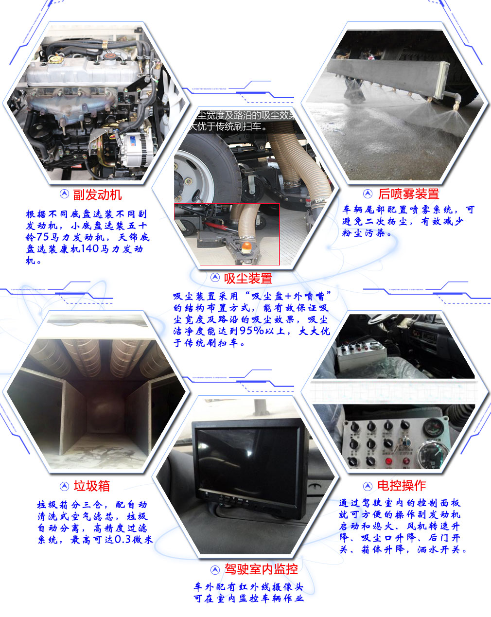 2、操縱便捷:只需要通過駕駛室內的控制面板就可方便的操作副發動機啟動和熄火、風機轉速升降、吸塵口升降、后門開關、箱體升降,灑水開關,并安裝工作視頻探頭。