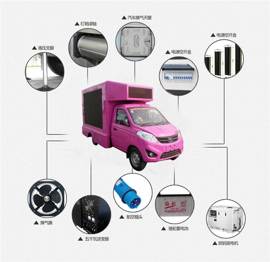 單面(一側LED屏幕、一側玻璃滾軸)或雙面LED屏幕(P6/P5/P4),尾部單色LED屏幕,翼虎汽油發電機(6.5kw/8kw)或蓄電池供電系統加220V外接電源,電瓶,逆變器,車廂前面前排氣扇2個,吸頂排氣天窗1個,中控系統(電腦顯示器、電腦主機、廣播級功放、4個防水音柱、航空外接電源接頭、30米外接電源線),豪華木地板/豪華鋁地板,易損件(一塊LED屏、一塊電源、長短5條快速接頭電源線)